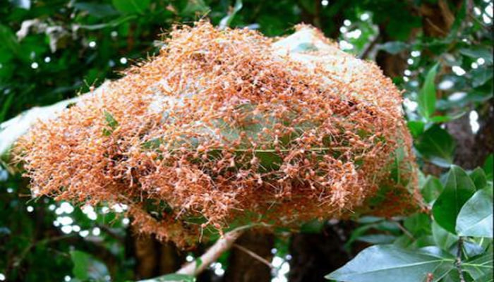 Uniknya, semut rangrang membangun sarang dengan cara “menjahit” daun-daun muda menggunakan sutra dari larva semut. Koloni ini bisa berisi ribuan semut, dengan satu ratu sebagai pusat produksi telur.